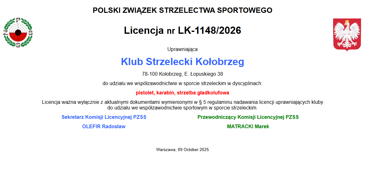 - Składki na rok 2026 (składki te same, zmiana wpisowego) - WNIOSEK O PRZYJĘCIE DO KLUBU: DRUK.DOC lub DRUK.PDF - Wypełniony wniosek dostarczamy do Klubu i na konto wpłacamy wpisowe oraz składkę roczną (proporcjonalną do ilośći pozostałych miesięcy do końca bieżącego roku). - Czekamy na emaila od Klubu z linkiem (zaproszeniem) do rejestracji na stronie PZSS. UWAGA! Od dnia wysłania zaproszenia przez Klub liczy się staż (jeden miesiąc) pozwalający zapisać się na Egzamin Patentowy. - Logujemy się na swoim koncie na stronie PZSS. Dokańczamy rejestrację poprzez wypełnienie wszystkich pól i dodaniu swojego zdjęcia legitymacyjnego. - LICENCJE ZAWODNICZE PZSS (jak się ma już patent): wszystkie licencje zawodnicze wnioskujemy tylko poprzez zalogowanie się na portalu informatycznym SOZ/PORTAL PZSS 1) Wniosek o nadanie licencji zawodniczej (pierwsza nasza licencja) na nią nie są wymagane starty w zawodach, lub 2) Wniosek o przedłużenie licencji zawodniczej (wypełniamy i zatwierdzamy), a także dostarczamy na emaila do Klubu wypełniony druk z naszymi startami w roku poprzednim (w roku kończącym się) DRUK.DOC lub DRUK.PDF lub 3) Wniosek o przedłużenie licencji zawodniczej ze sprawdzianem w przypadku braku startów w roku poprzednim (wypełniamy, zatwierdzamy i kontaktujemy się z Klubem) lub 4) Wniosek o nadanie licencji zawodniczej w strzelaniach pneumatycznch (nie wymaga się posiadania patentu) DRUK - BADANIA LEKARSKIE DLA SPORTOWCÓW INFOPliki dotyczące patentu strzeleckiego: